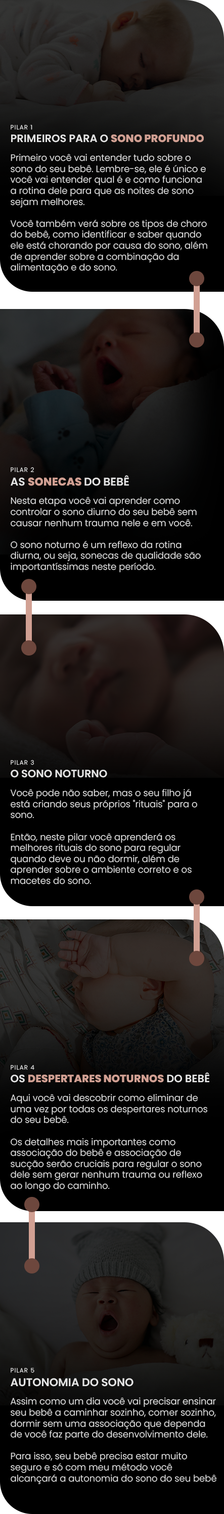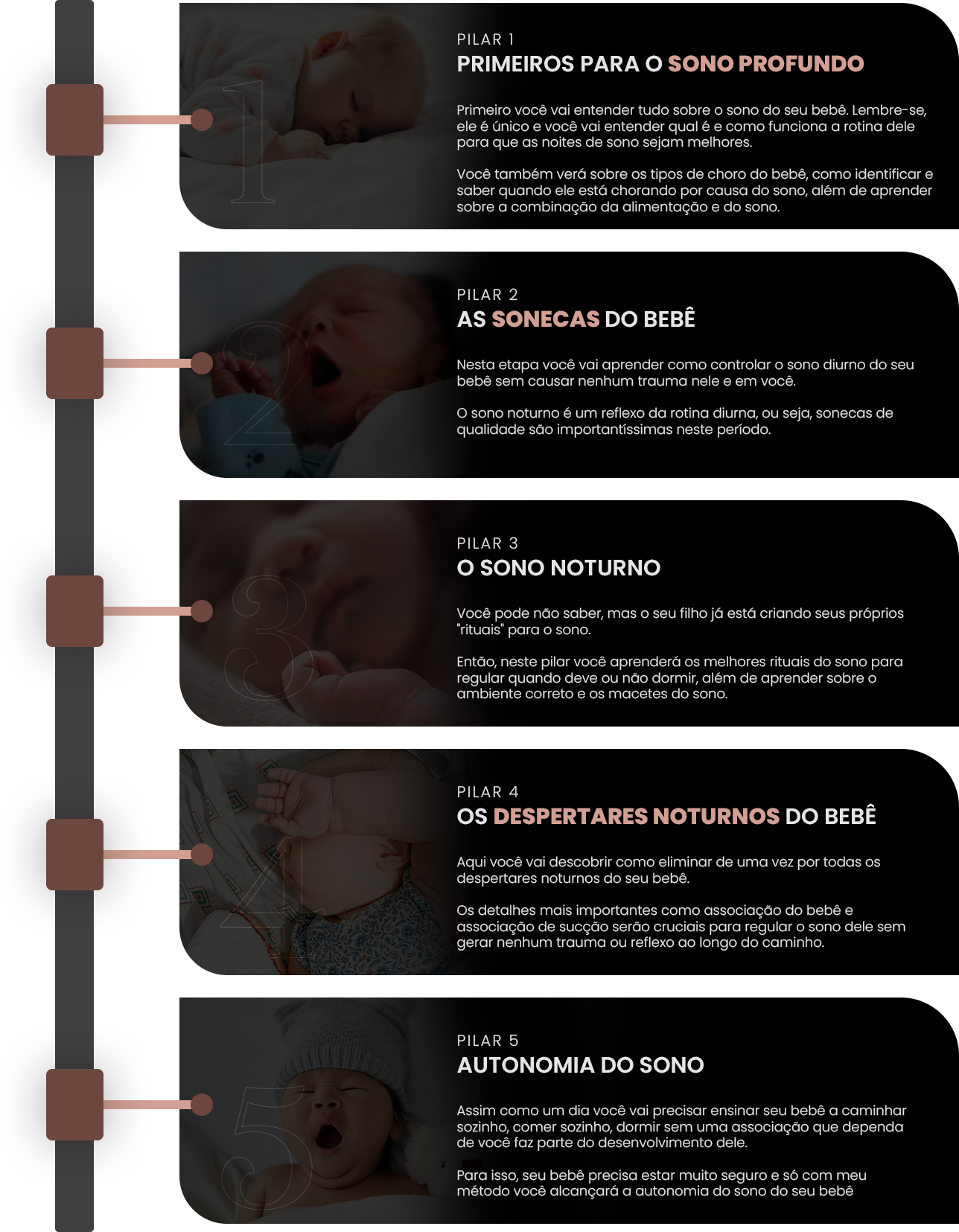 O Manual do Sono 5.0 não é apenas mais um guia de rotinas rígidas. Ele é um método baseado em 5 pilares essenciais que ajudam mães como você a entenderem as reais necessidades de sono do bebê e a aplicarem mudanças que funcionam, sem culpa, sem exaustão e sem deixar de lado o carinho e a conexão